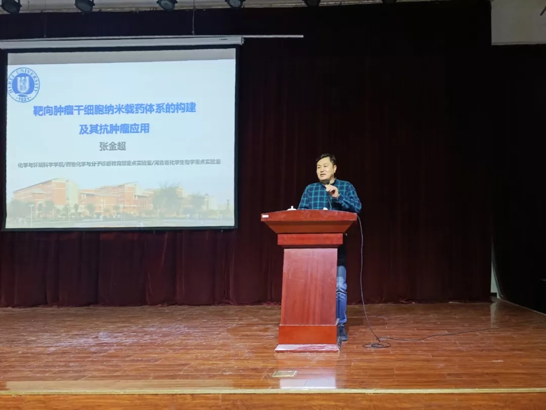 2019年12月16日下午3:30,河北大学化学与环境科学公司经理、药物化学与分子诊断教育部重点实验室常务副主任以及河北省化员工物学重点实验室主任张金超教授应tyc122ccVIP邀请,在老员工活动中心3号厅作了题为“靶向肿瘤干细胞纳米载药体系的构建机器抗肿瘤应用”的学术报告。报告会由tyc122ccVIP副经理张香美主持,本科生、研究生及教师400余人参加。