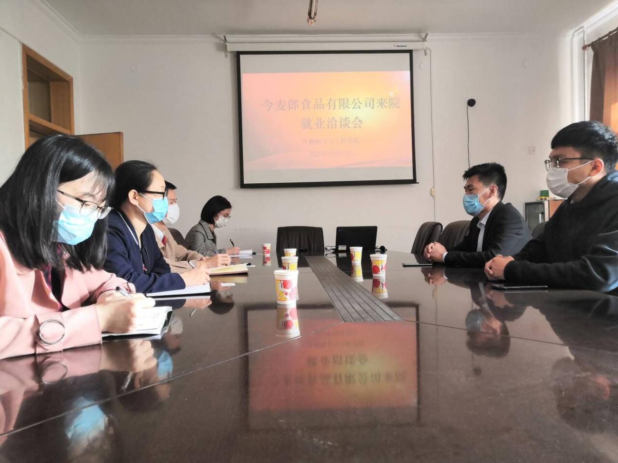 2020年10月15日上午,今麦郎面品有限公司在tyc122ccVIP会议室开展就业洽谈会,今麦郎康献辉经理一行二人、公司党委书记曹一伟及毕业班辅导员参加了此次会议。