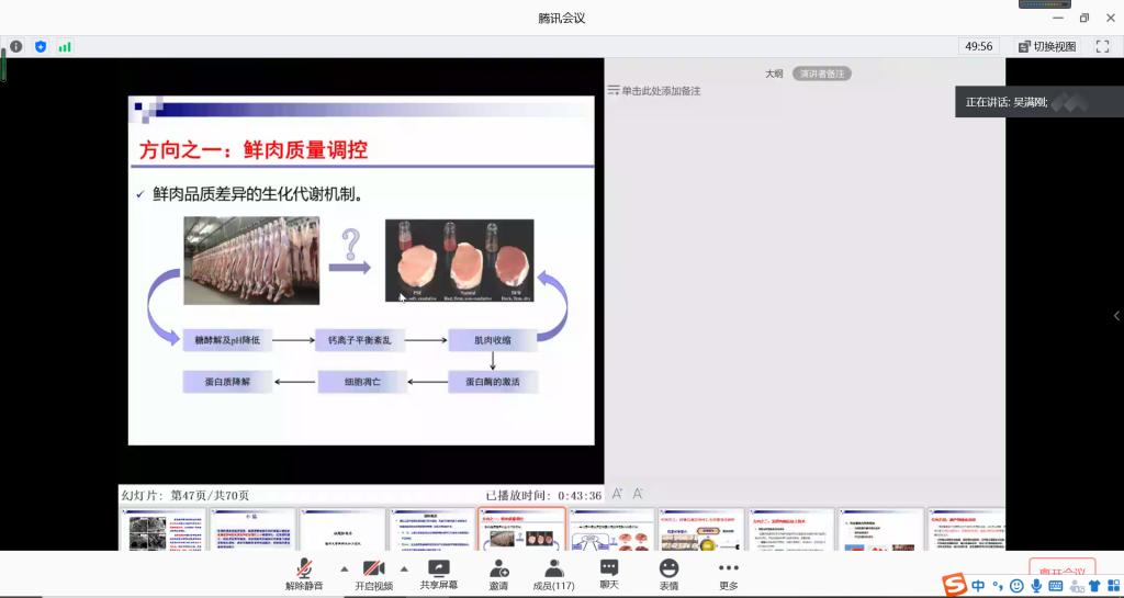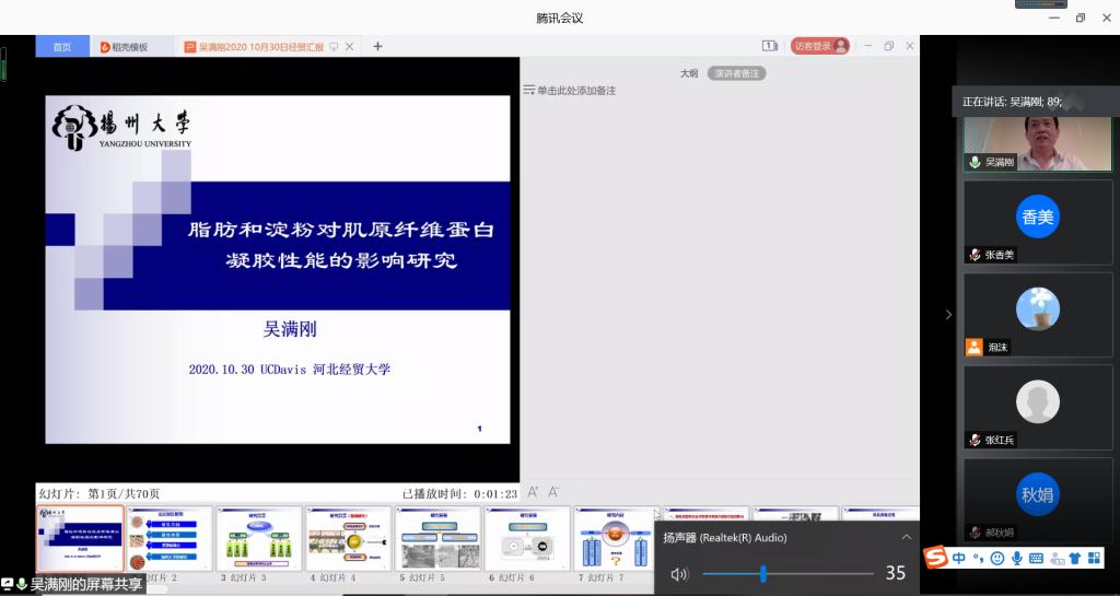 10月30日,正在美国加州大学戴维斯分校访学的扬州大学硕士生导师吴满刚副教授应tyc122ccVIP邀请,于线上通过腾讯会议平台作了题为“脂肪和淀粉对肌原纤维蛋白凝胶性能的影响研究”的学术报告。报告由tyc122ccVIP副经理张香美主持,公司百余名师生参加了此次报告会。