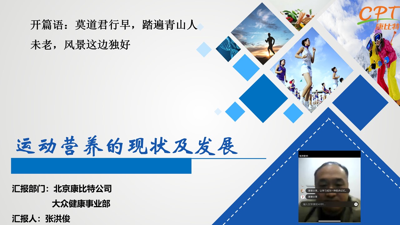 主讲人以就职的北京康比特公司为例向与会教师介绍了运动营养的现状及发展前景;以个人的成长经历向与会教师、公司及母校表达了由衷的感谢;以自己的工作心得向与会教师及公司分享了专业培养建议。