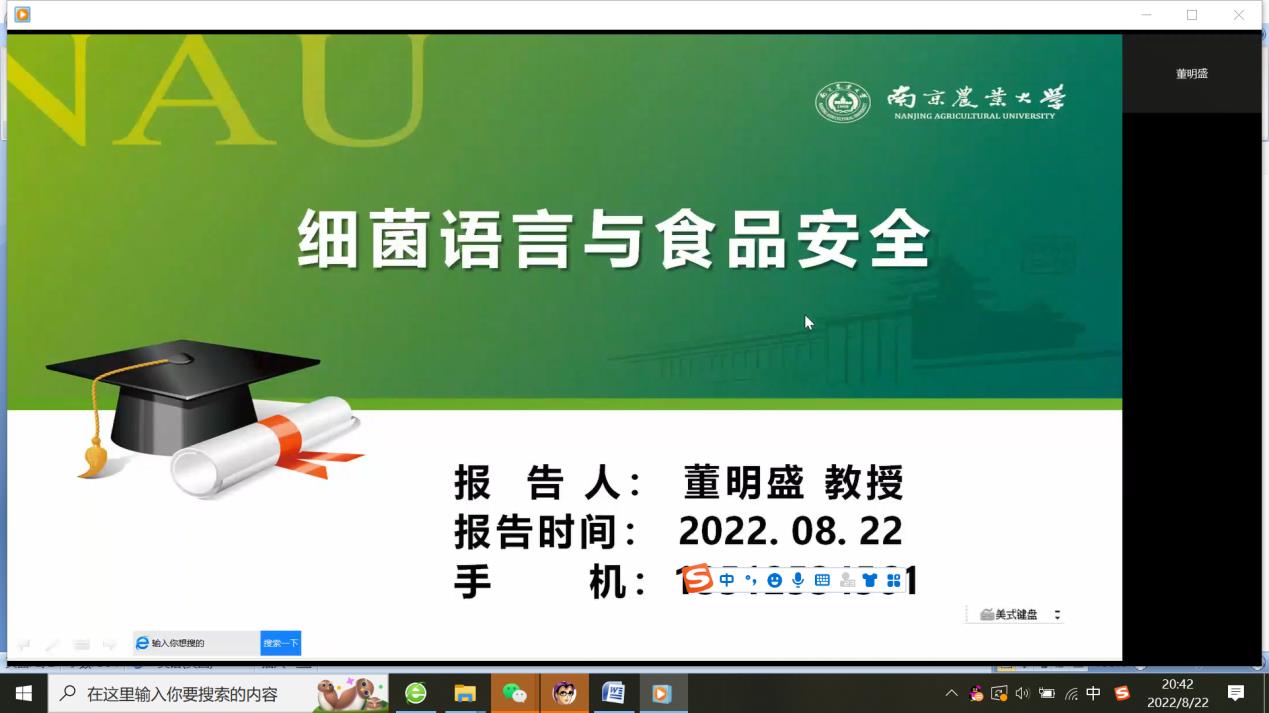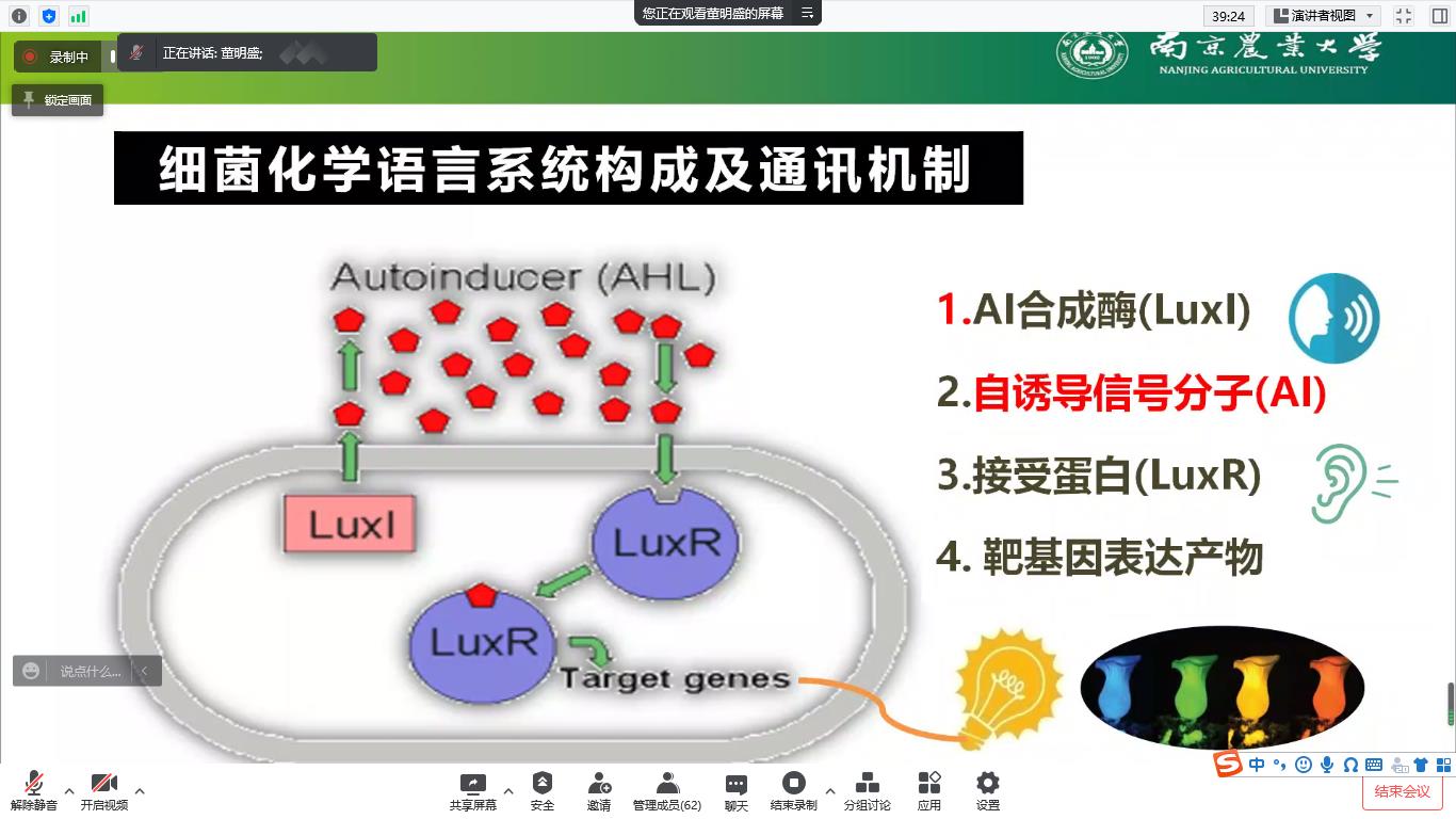 8月22日,应tyc122ccVIP邀请,南京农业大学董明盛教授(博导)通过腾讯会议作了题为《细菌语言与食品安全(Quorum Sensing and Food Safety)》的学术报告。报告会由公司副经理张香美主持,公司教职工及员工110余人参加。