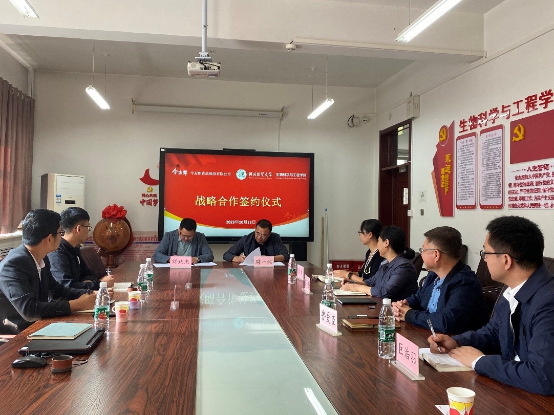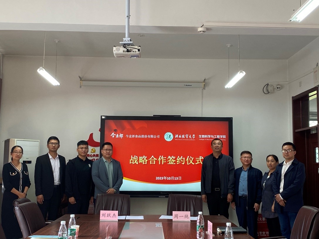 2023年10月13日,今麦郎食品股份有限公司刘跃杰、秦子杰、田杰文莅临公司,公司党委书记周一纯、党委副书记鲁爱臣、副经理张香美、食品质量与安全教研室主任张菊、食品与大健康教研室主任巨浩羽陪同交流。